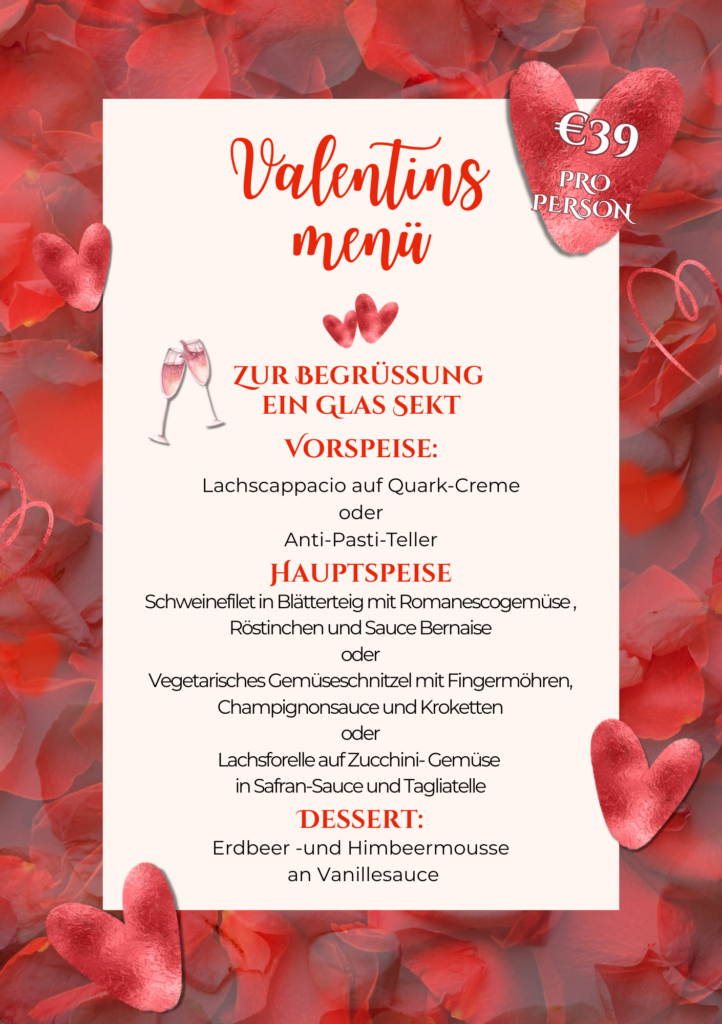 Wie wäre eine LECKERE und ROMANTISCHE Überraschung zum Valentinstag? Wir haben ein tolles Menü für Euch zusammengestellt! Bitte vorab reservieren! Wir freuen uns auf Euch!